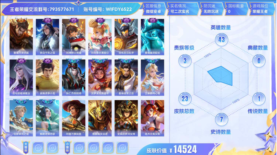 【WIFDY6522】 传说1 史诗7 限定7 英雄43 皮 查看详情